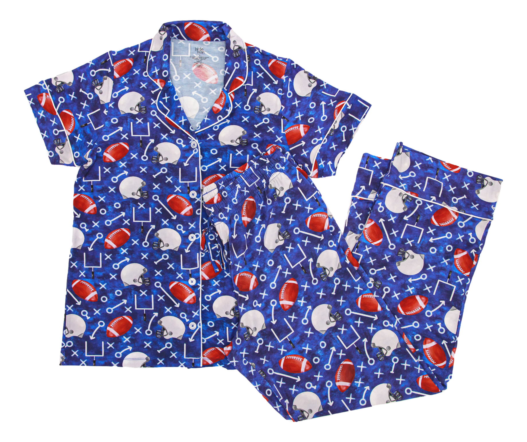Thoughtful details like the button-front top with contrast piping, elastic waistband, adjustable drawstring, and functional pockets add both style and practicality. Finished in a playful, sports-inspired print, the Troy Lounge Set is perfect for relaxed weekends, cozy nights, and matching moments with your favorite little birdies.