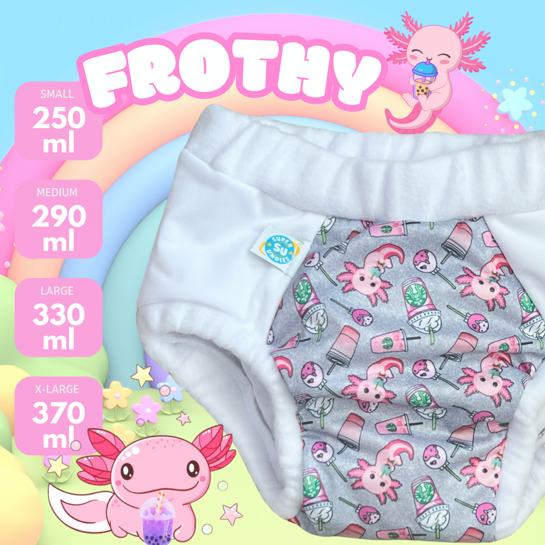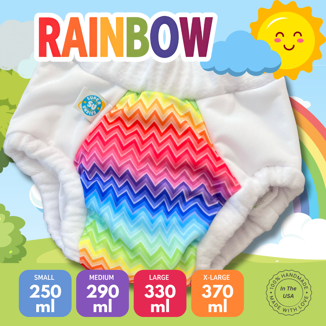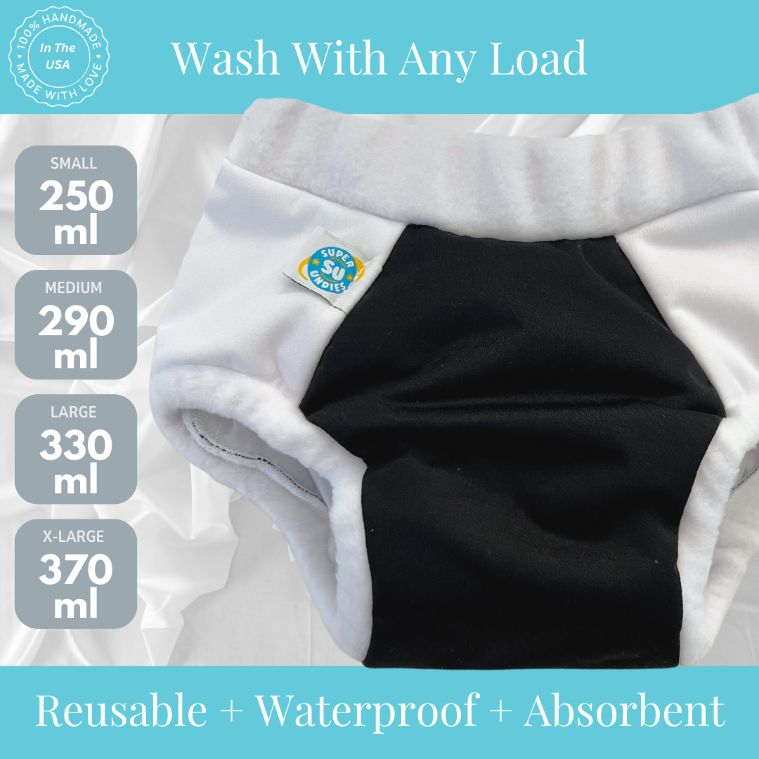 - Waterproof guards at top of the tummy and back area redirect wetness back to the absorbency