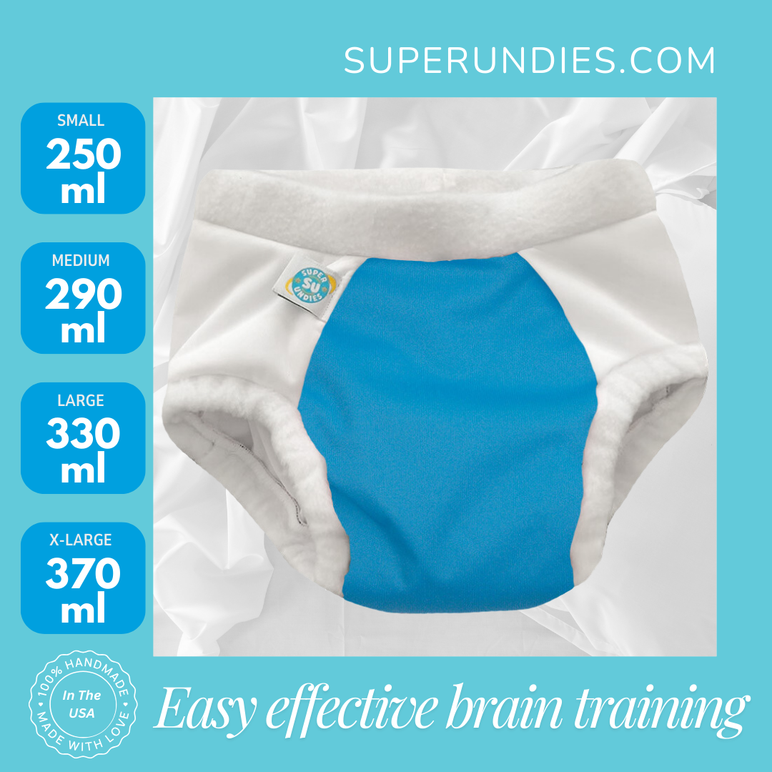 Preventing leaks requires a good fit and the right absorbency in the right place. For instance, a girl may need a Training Pad in the center of the trainer, like a maxi-pad, since girls pee centrally downward. While a boy may need an absorbency boost with a Soaker Bomb in the front of the training pant, since they saturate primarily at the front of their bodies. Super Undies Brain Trainers have been uniquely developed to customize the placement of absorbency, and to allow for the expansion of absorbency in the cases that require it. The majority of children do not need more absorbency beyond what is included with your Brain Trainers, yet it is possible for your child to pee more than the trainer can absorb.