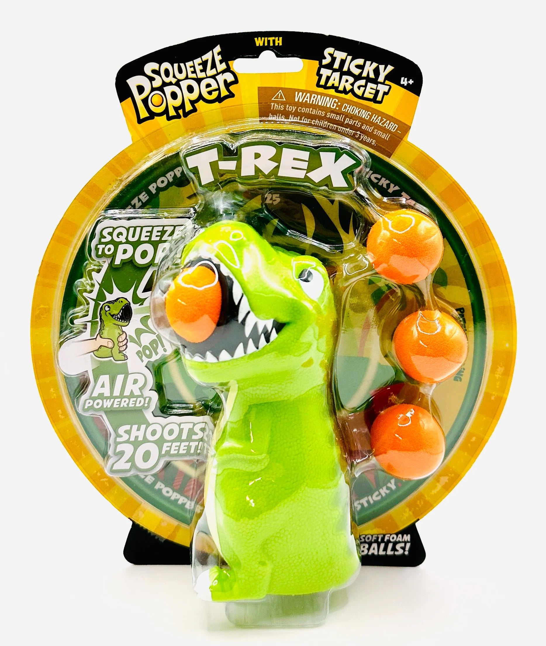 Whether it’s indoor fun, family game night, or a backyard challenge, the T-Rex Squeeze Popper with Sticky Target turns ordinary play into a Jurassic adventure!