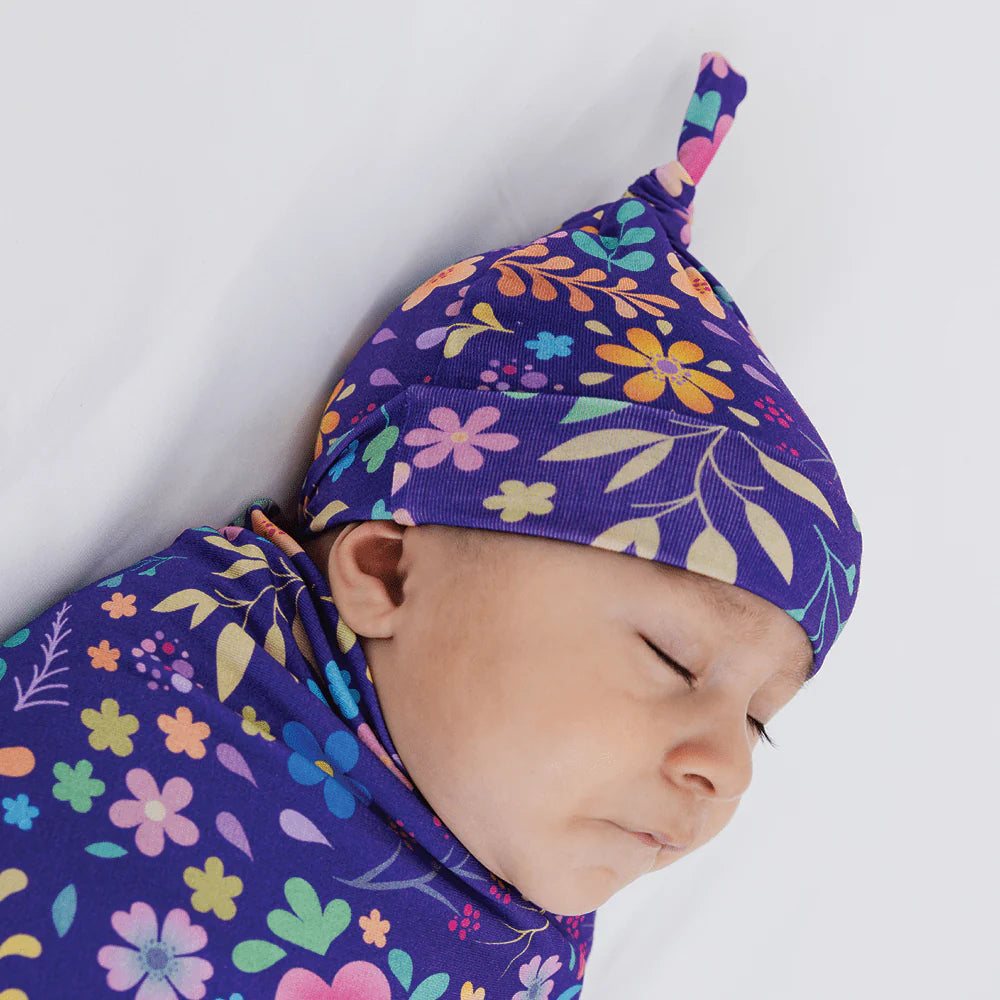 Sprinkled with orchids and blooming wildflowers, our signature print purple baby hat highlights the diverse beauty of nature.