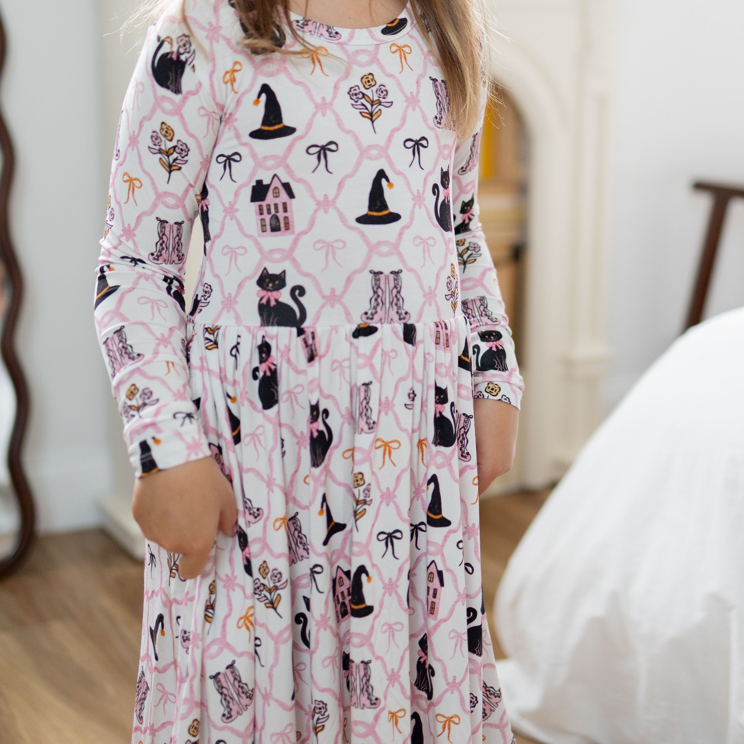 Adorned with charming black cats, witch hats, and pretty bows on a soft blush background, this dress is designed for endless twirls and year-round comfort. The long sleeves make it perfect for cooler days, while the tagless design keeps sensitive skin happy.