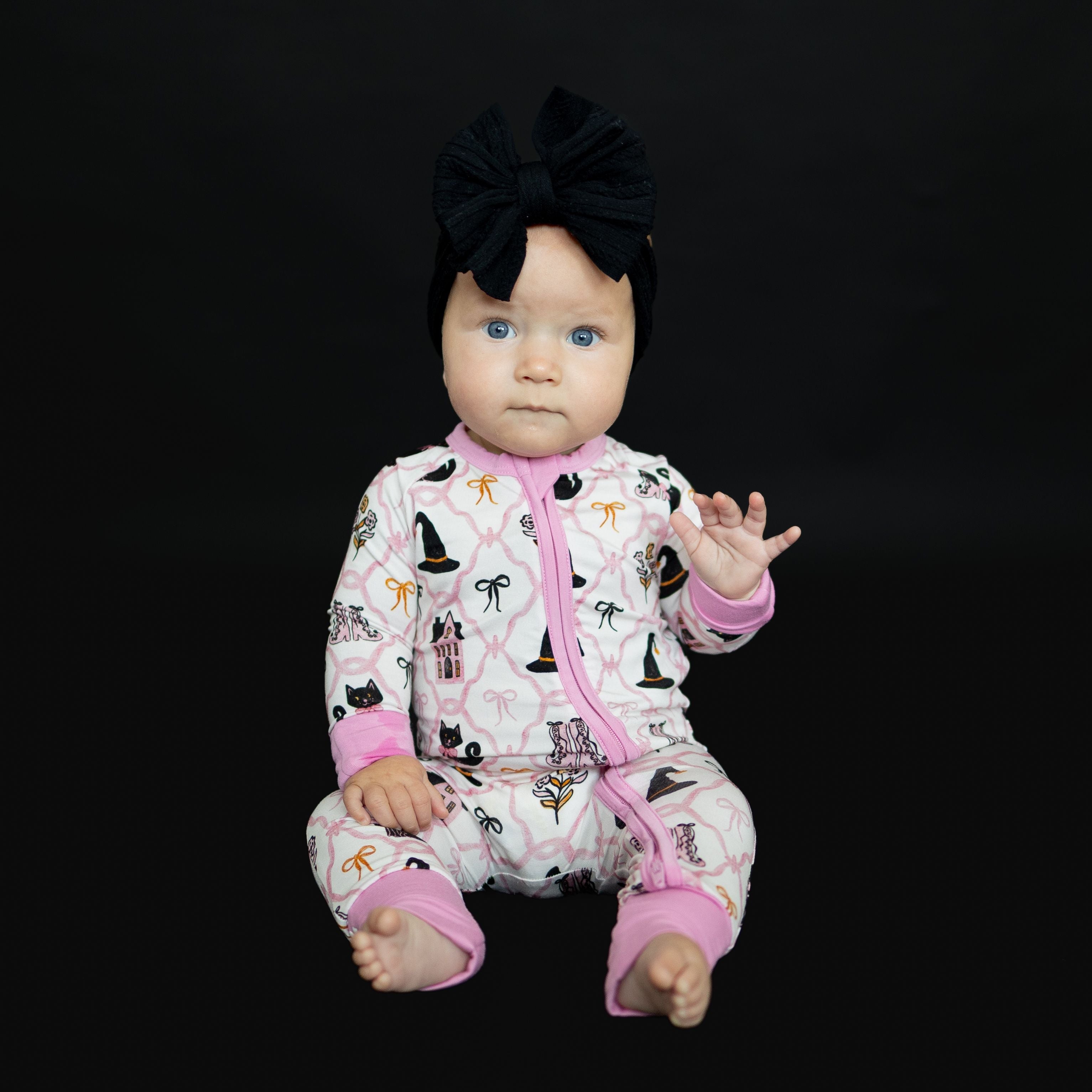 A little bit spooky, a whole lot sweet! Our Sweet Salem Halloween Romper is made from our signature buttery-soft bamboo fabric, keeping your little one cozy and comfy from the pumpkin patch to bedtime snuggles. With charming black cats, witch hats, and pastel bows on a soft pink background, this romper brings a playful twist to Halloween style.