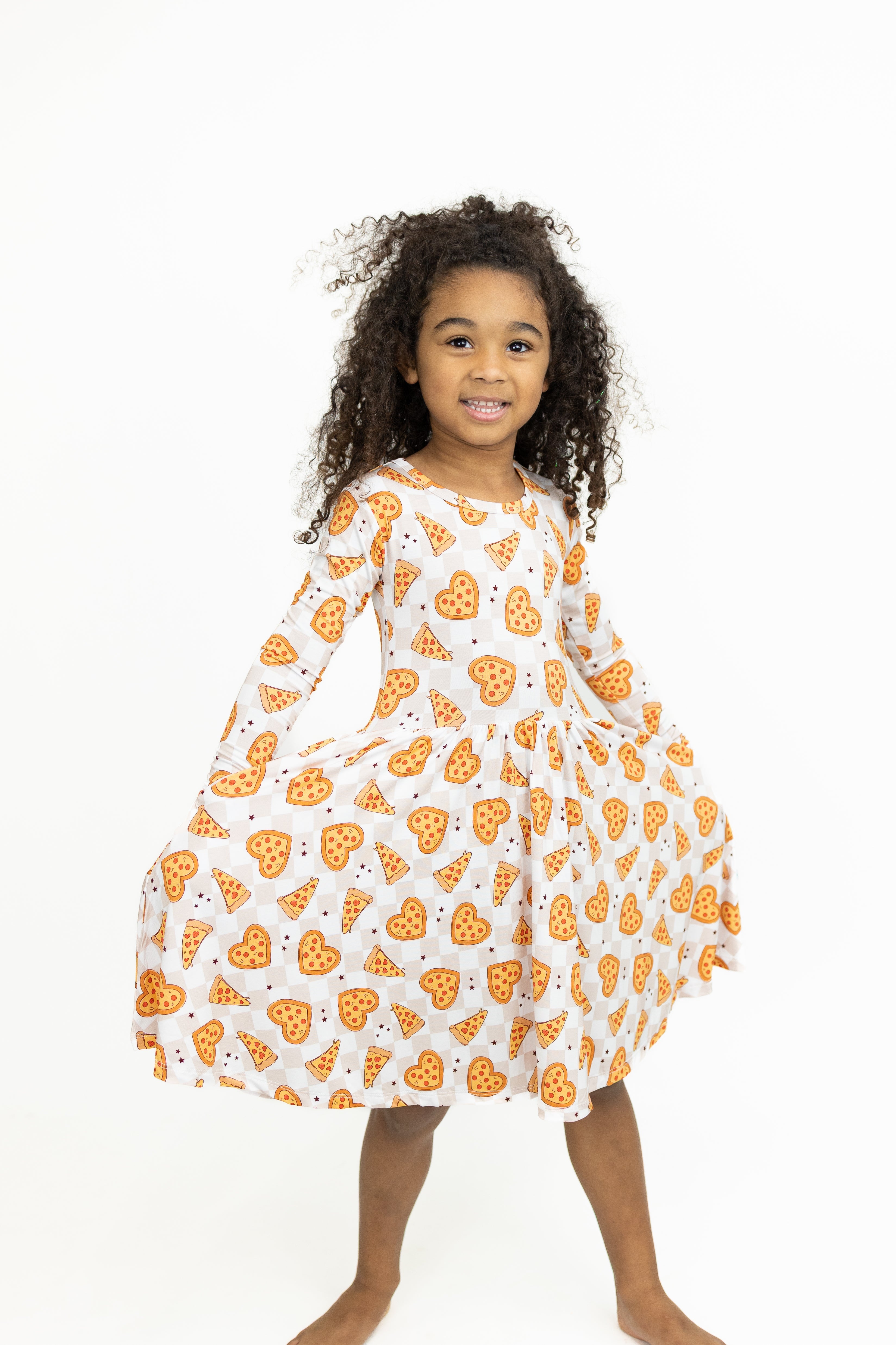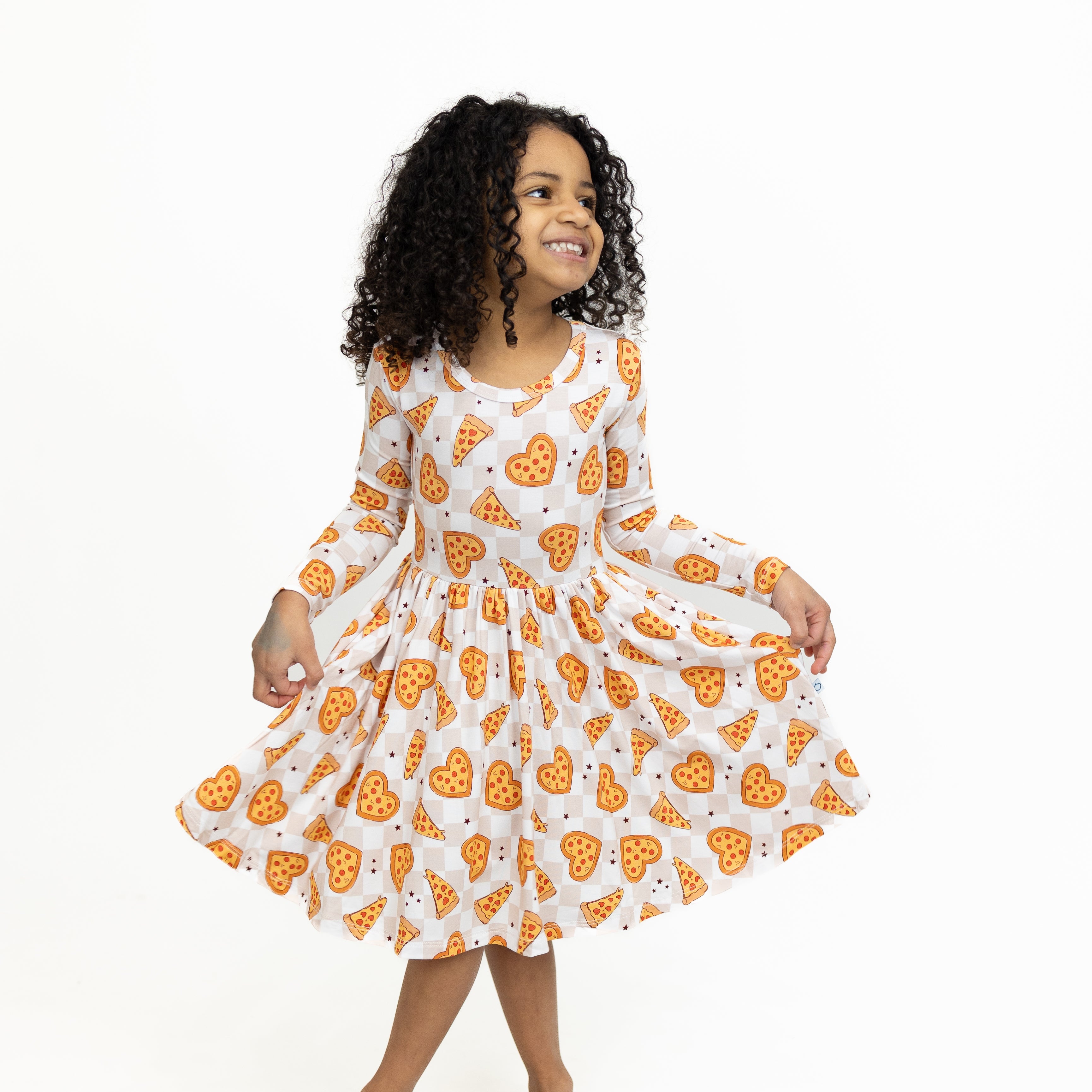 The Pizza My Heart Twirl Dress brings fun and comfort together in a playful, kid-approved style. Made from ultra-soft bamboo lyocell, this neutral checker dress features heart-shaped pizzas for a whimsical look that still feels wearable year-round. Designed with a relaxed fit and plenty of twirl, it’s perfect for lounging, playing, or sleeping. Breathable, hypoallergenic, and soft wash after wash, it’s a favorite for kids who love comfort with personality.