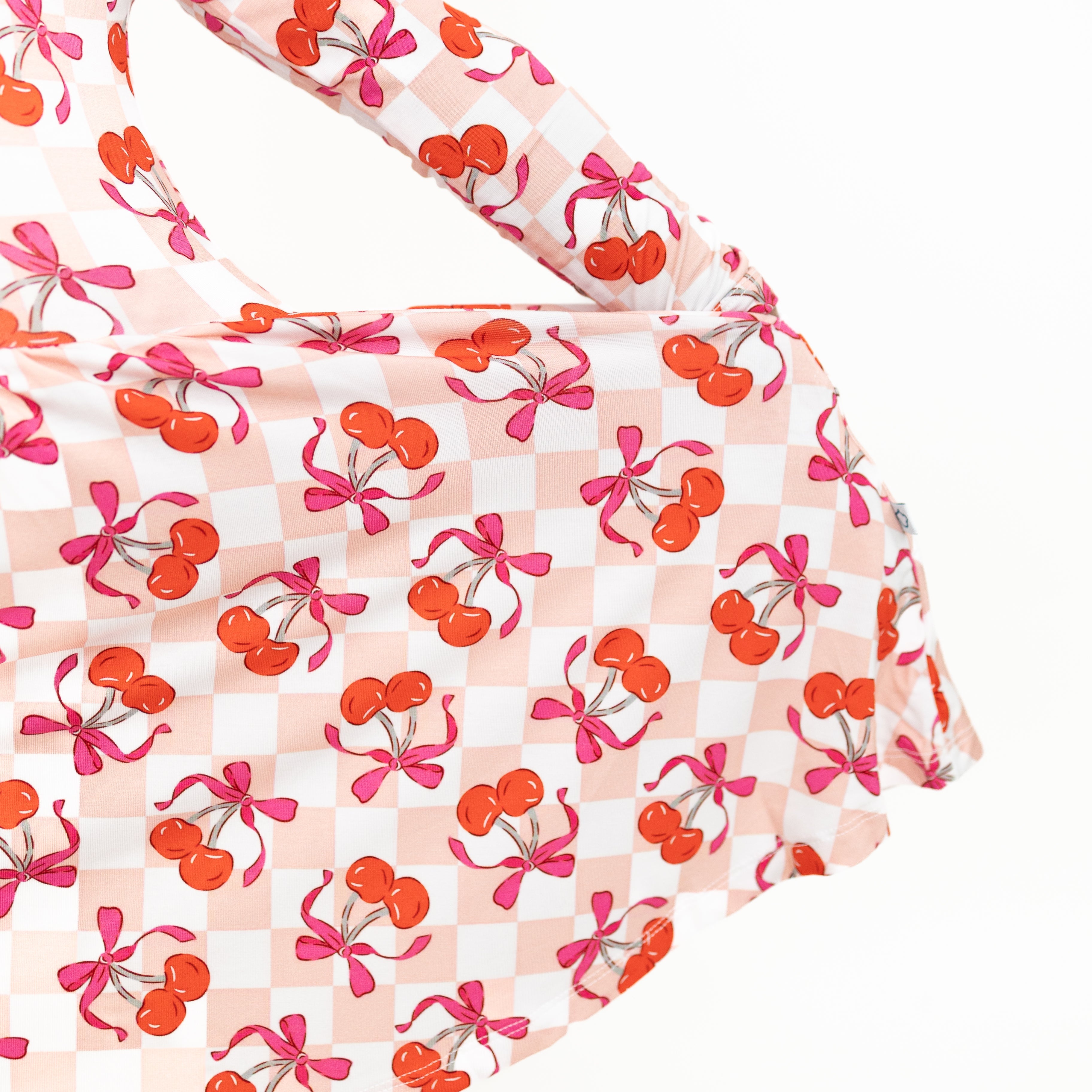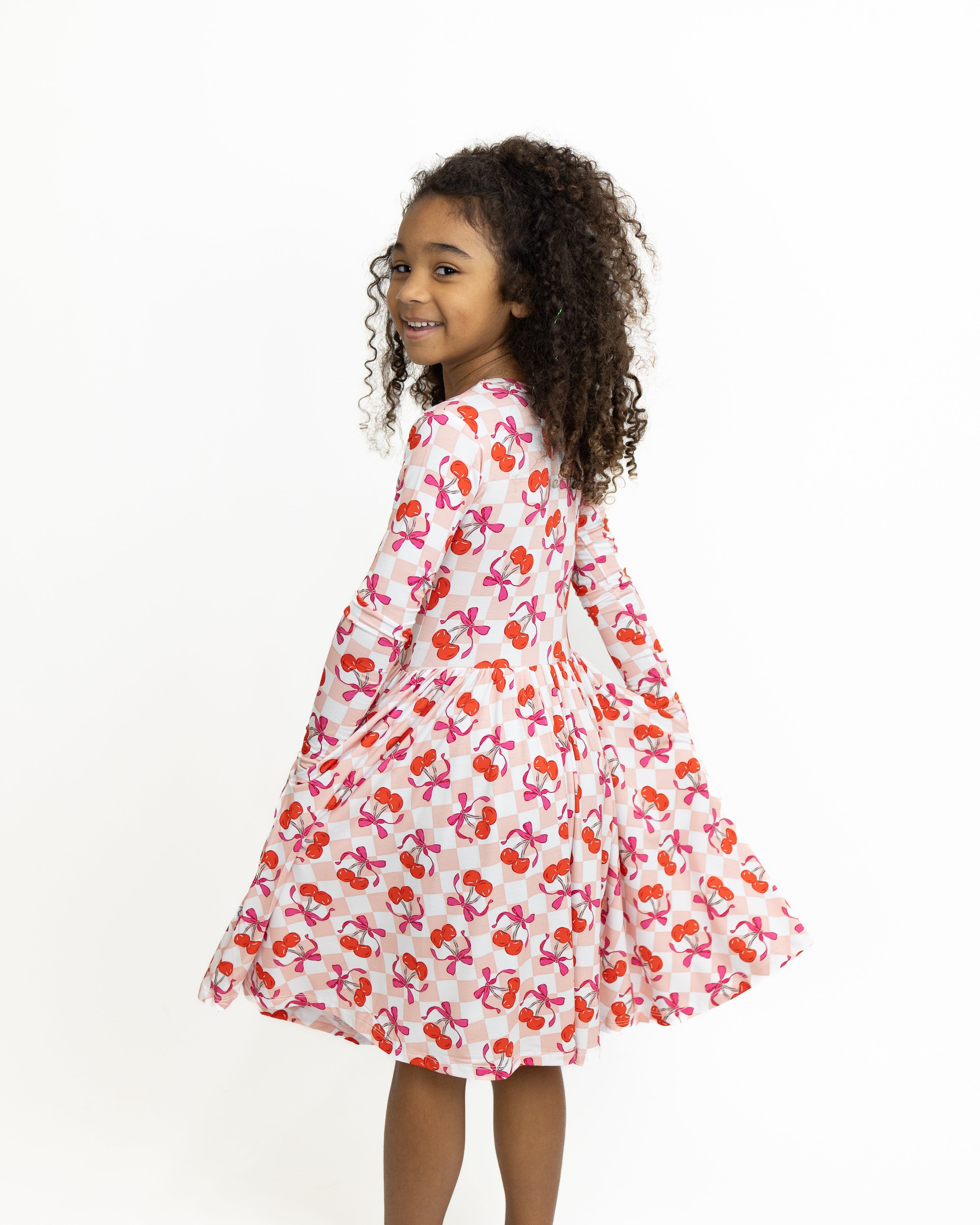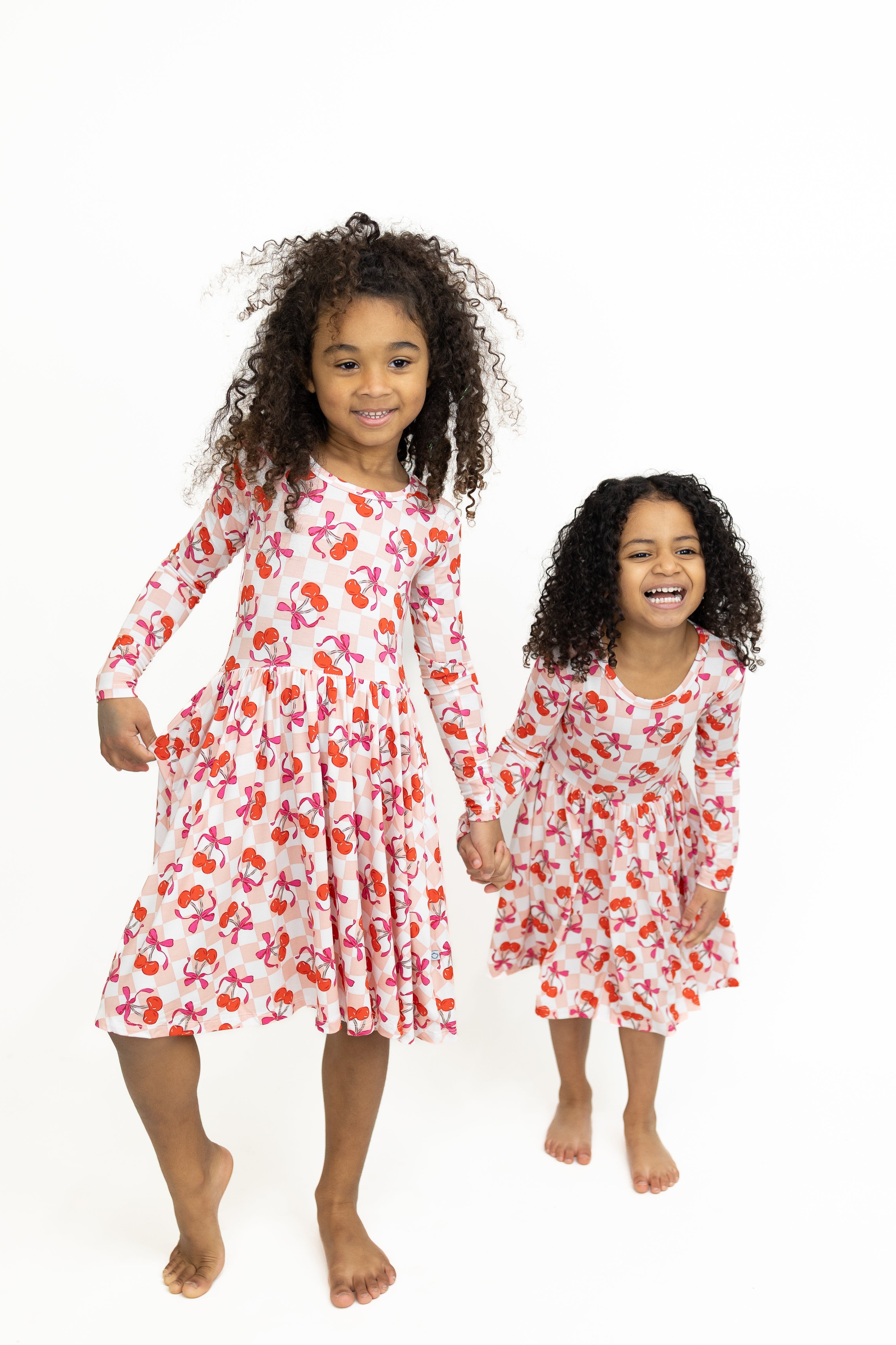 The Pink Cherry Love Twirl Dress is made for spinning, smiling, and sweet everyday moments. Crafted from buttery-soft bamboo lyocell, this pink checker dress features playful cherries and bows for a girly look kids love. Lightweight, breathable, and naturally stretchy, it offers all-day comfort for playtime or bedtime. Hypoallergenic and temperature-regulating, this twirl dress is gentle on sensitive skin and designed to last.