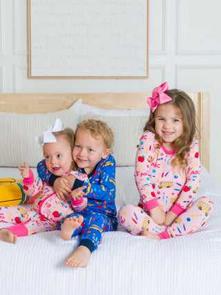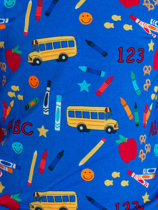 The playful school-themed print features yellow buses, colorful art supplies, tasty snacks, and an apple for the teacher—making them perfect for celebrating the new school year. Whether it’s the night before the big day or a cozy evening after homework, these pajamas are made for sweet dreams and big adventures.