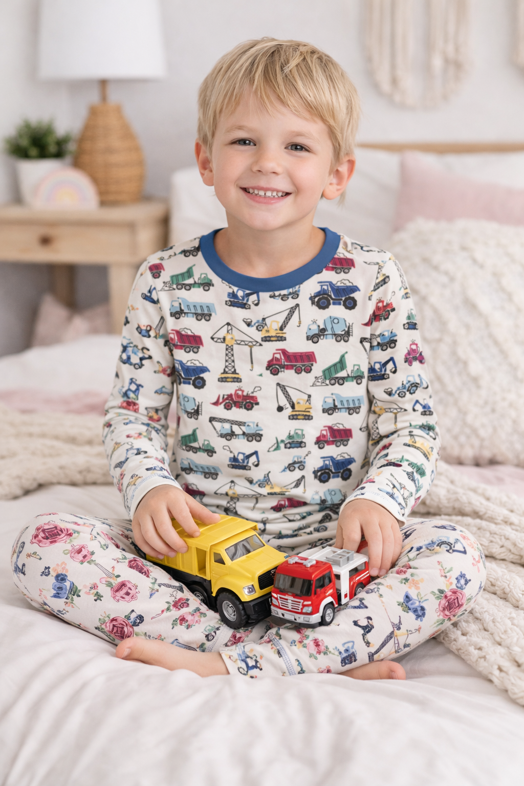 Long Sleeve Pajama Set in Natural Construction Trucks
