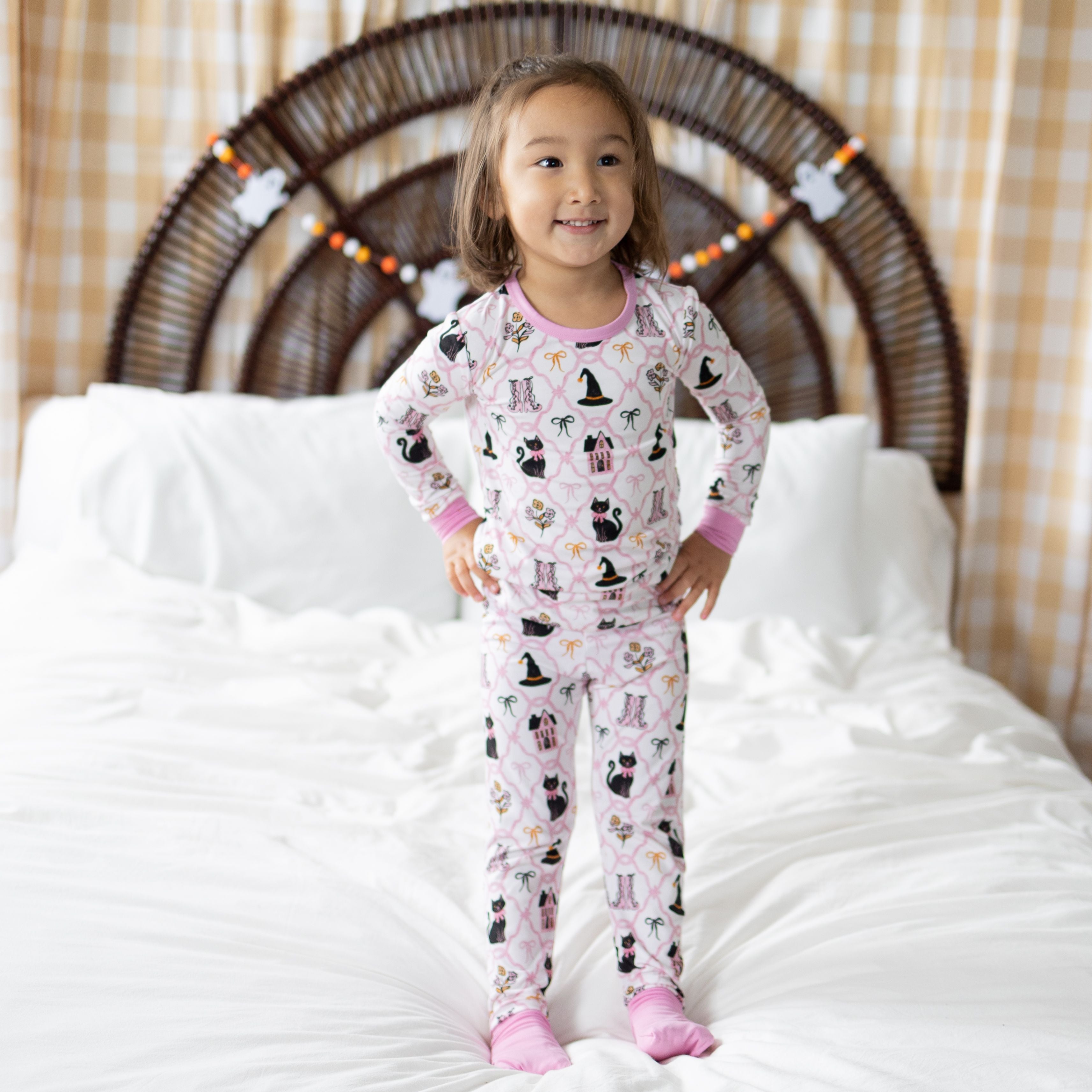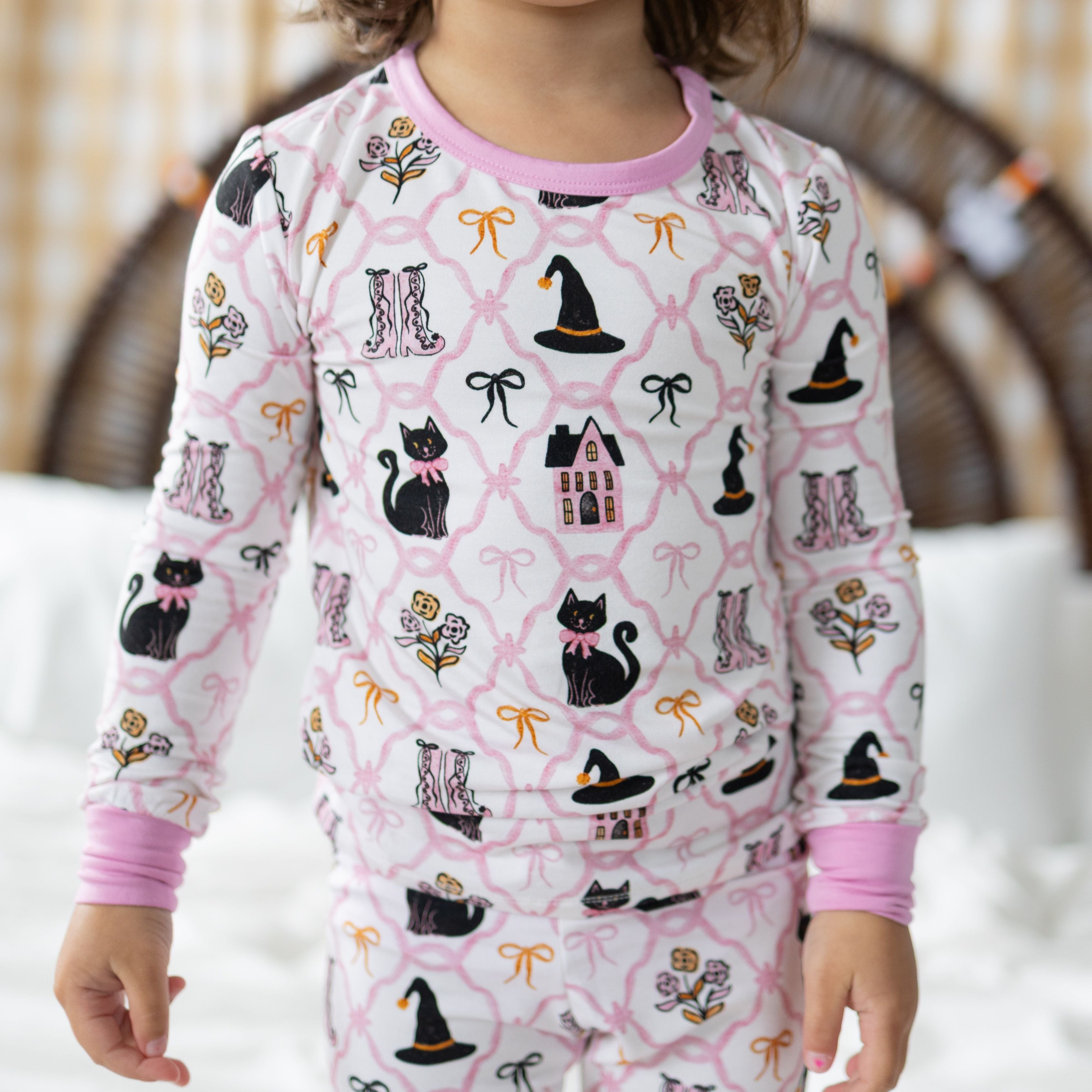 Cozy nights just got a little more magical! Our Sweet Salem Halloween Long Set is crafted from our signature buttery-soft bamboo fabric, perfect for spooky season lounging or all-day play. Featuring playful black cats, witch hats, and pastel bows on a soft pink backdrop, it’s a sweet and whimsical take on Halloween style.