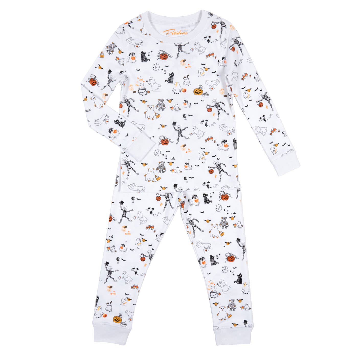 Get your little one ready for the spookiest season with our Petidoux Halloween Party Pajamasâa festive set featuring friendly ghosts, dancing skeletons, mummy bears, playful cats and dogs, and smiling pumpkins. Each detail comes from Petidouxâs original, hand-drawn design, bringing charm and whimsy to bedtime.