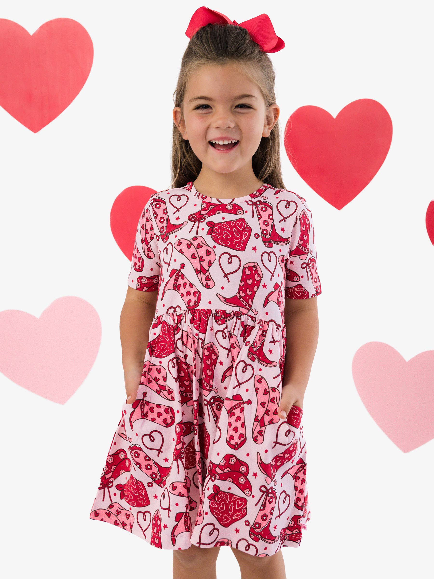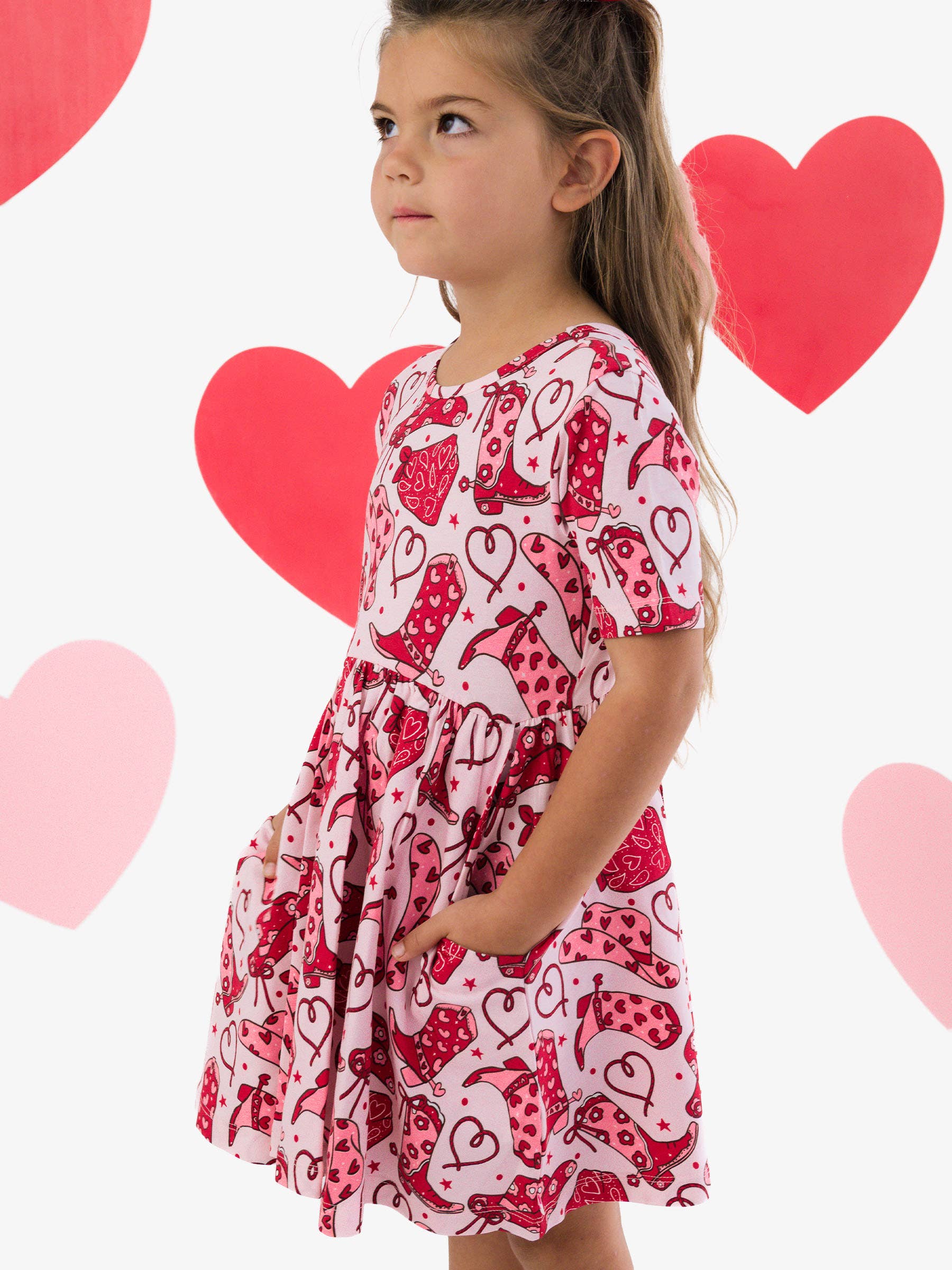 Spin, smile, repeat 🤍🤠 The Lasso Love Knit Short Sleeve Twirl Dress is made for girls who love to move, twirl, and feel comfortable doing it. Crafted from a soft cotton-spandex knit, this dress offers the perfect blend of stretch, breathability, and everyday durability.