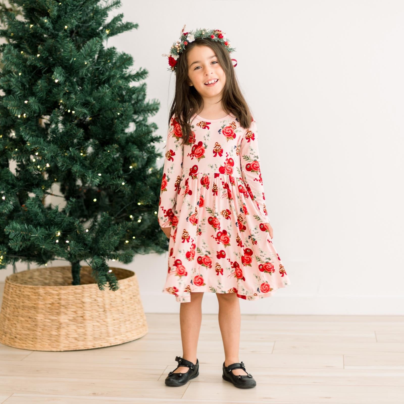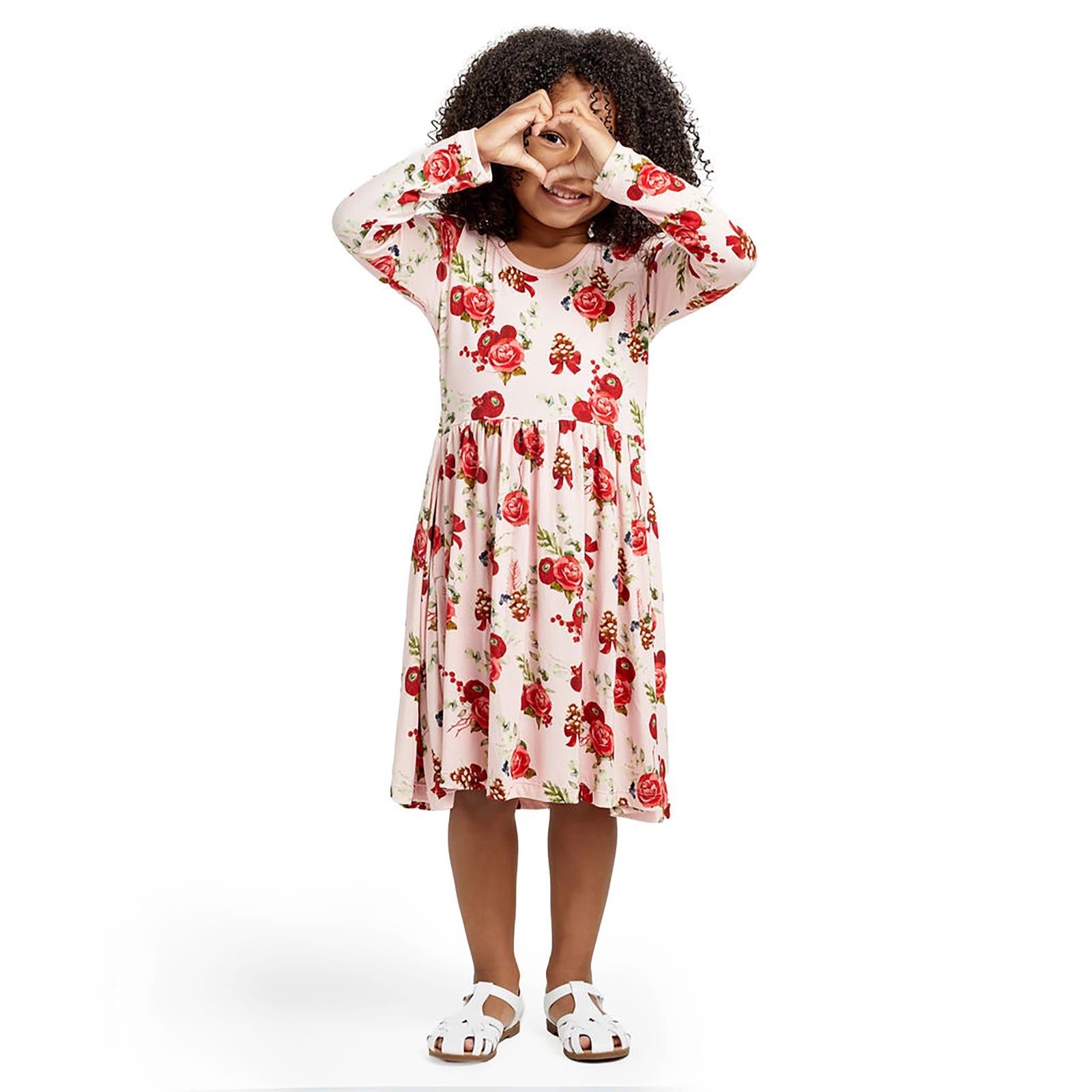 She'll be the hit of the party! Our darling long sleeve twirl dress has a fitted top and a flowy skirt below the waist so it swishes as plays. Now with pockets! Pair with tights or leggings for a stylish ensemble.