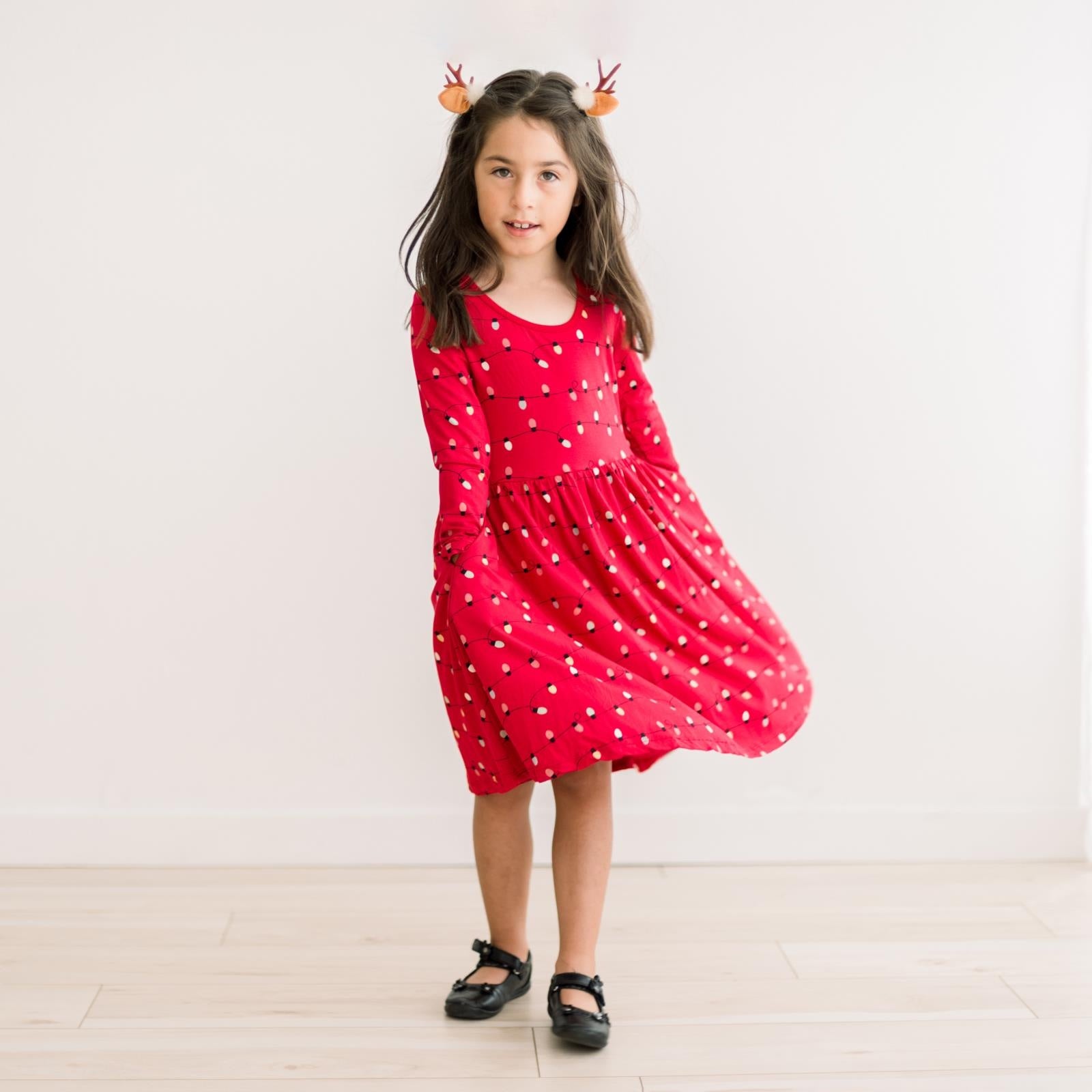 Long Sleeve Twirl Dress with Pockets in Crimson Holiday Lights