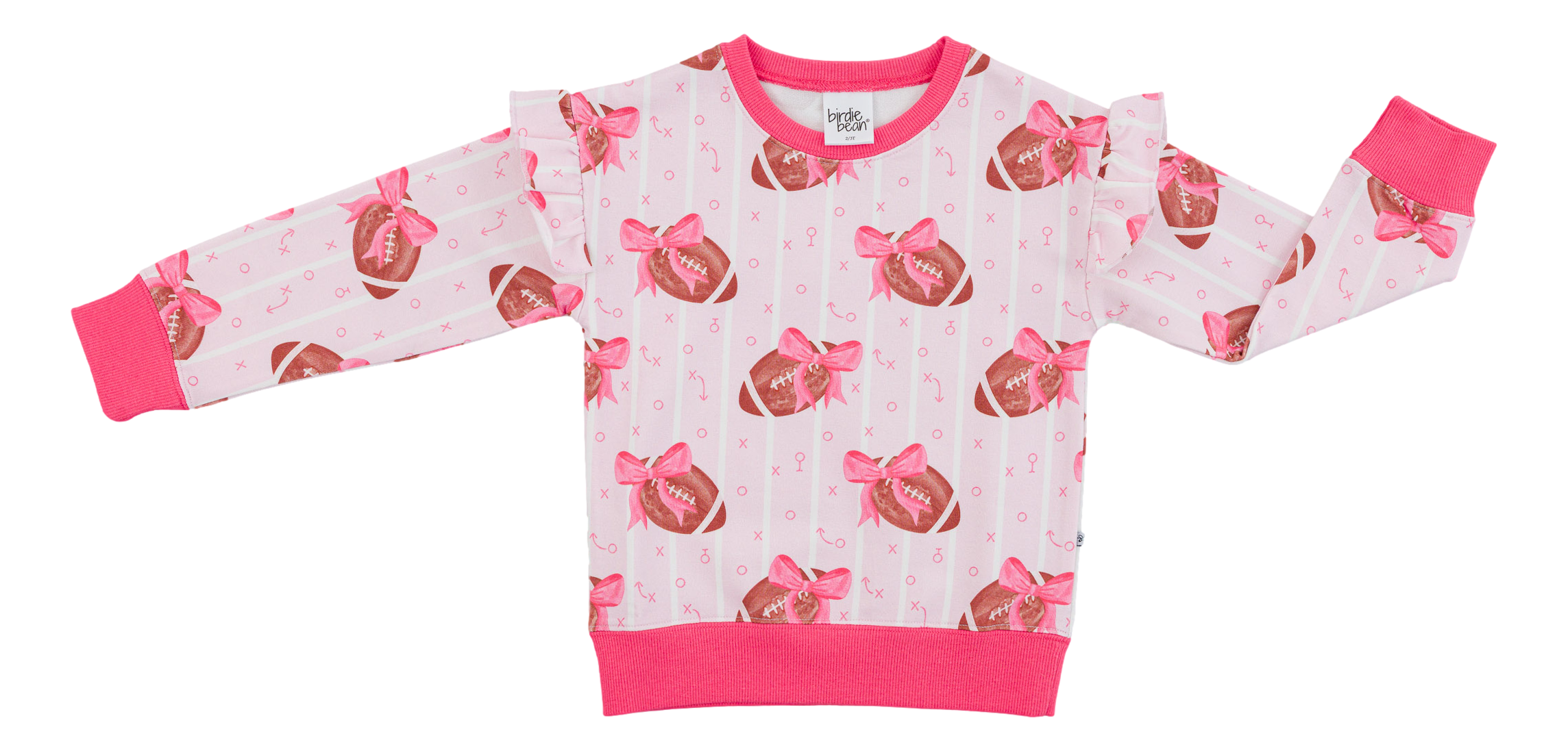 Cozy, cute, and ready for game day. This pullover is covered in our fan-favorite football-with-bows print with pop of pink trim—perfect for little cheer captains and sideline snack pros. Easy to throw on for school, practice, or stadium seats, and adorable with leggings, joggers, or jeans.