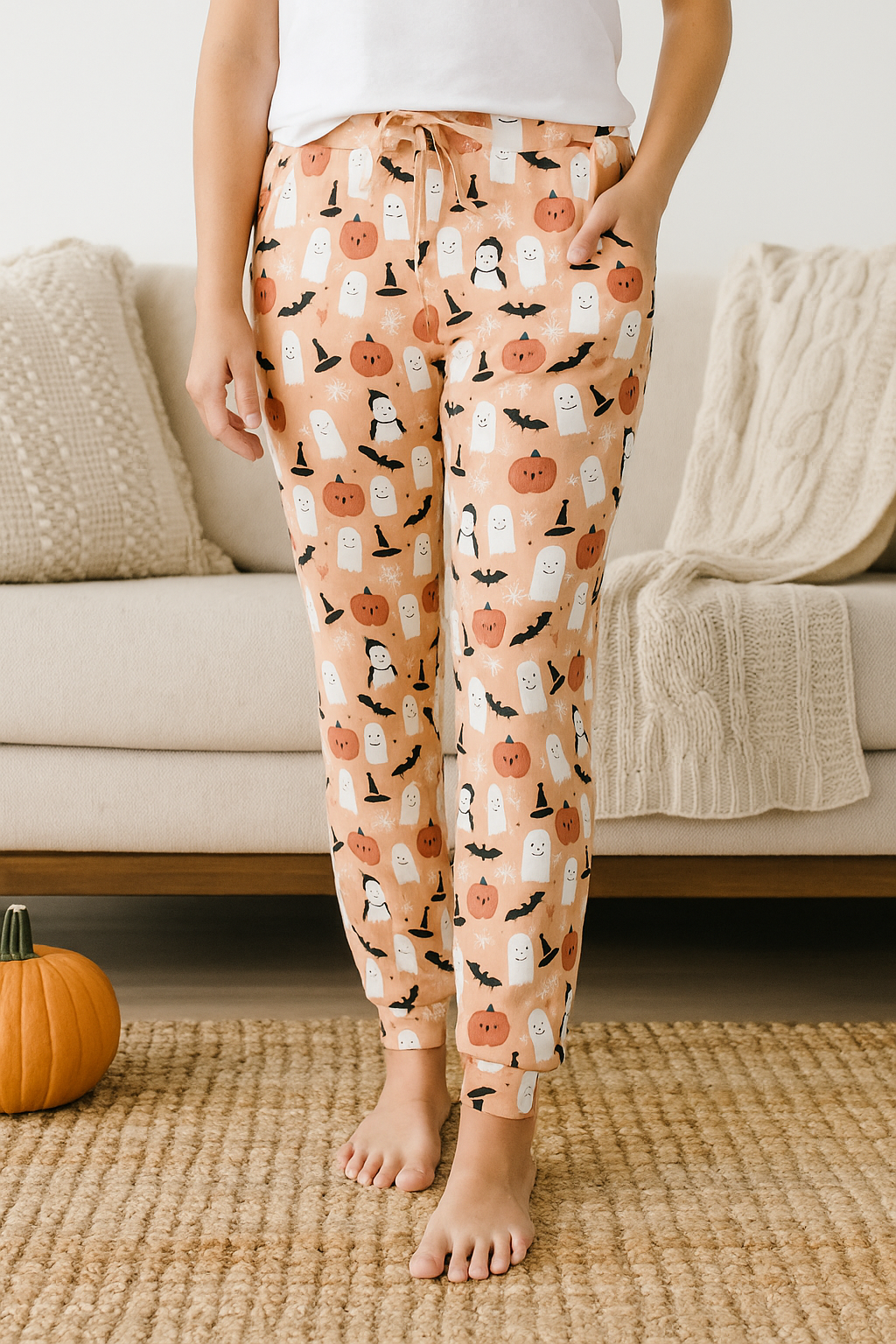Get cozy in spooky-cute style with our Boo-tastic Lounge Pants! Featuring the most adorable ghosts, pumpkins, bats, and witch hats in a playful Halloween pattern that glows in the dark, these pants are a must-have for fall lounging. Made with buttery soft, stretchy fabric and a comfy drawstring waistband, they’re perfect for movie nights, trick-or-treating, or matching the whole fam for spooky season fun. Snag yours before they vanish like a ghost!