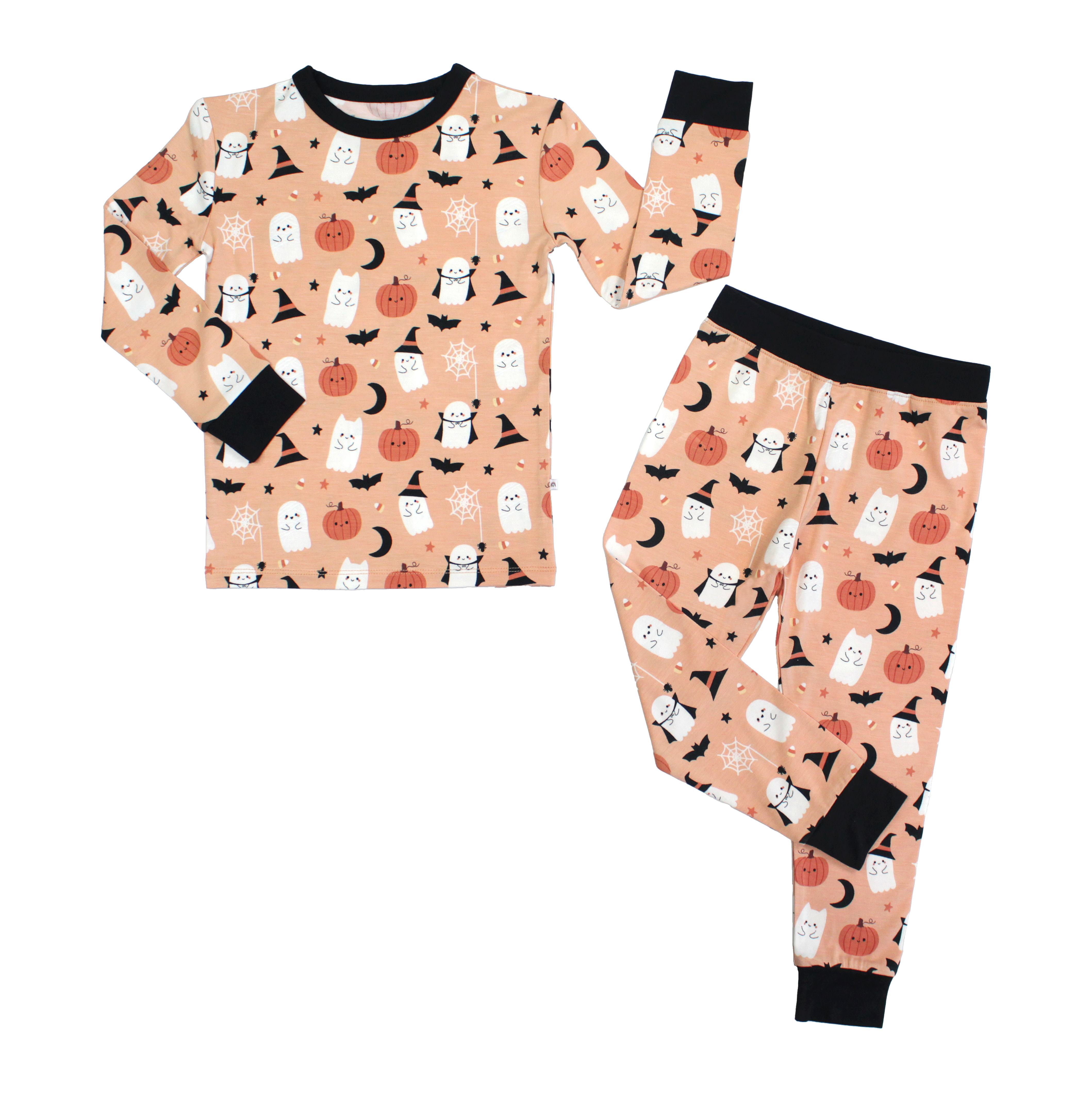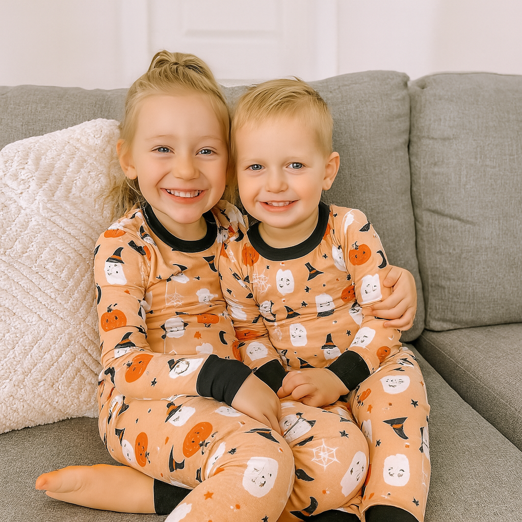 Light up spooky season with our Boo-tastic Glow-in-the-Dark Pajama Set! 🎃👻 Made for your little ghouls and goblins, this two-piece pajama set is decked out in an adorable all-over Halloween print—featuring ghosts, pumpkins, bats, and more—on a soft, peachy-orange base.