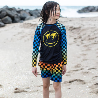 Give your little one standout style with Appaman’s Mid Length Swim Trunks in Checkerboard. Crafted from durable, quick-dry fabric, these trunks offer comfort and flexibility for both water and playtime adventures. The vibrant checkerboard print keeps him cool, while the high-quality construction ensures lasting wear. Perfect for active summer days! Pair with Long Sleeve Rash Guard Happy Surfing Checkerboard to complete the matching set!