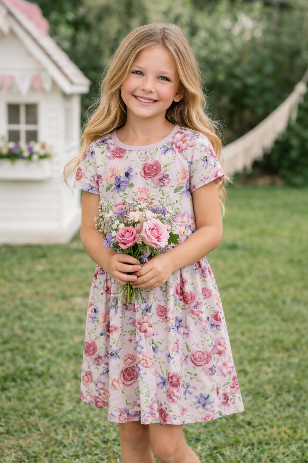 She'll be the hit of the party! Our darling short sleeve twirl dress has a fitted top and a flowy skirt below the waist so it swishes as plays. Now with pockets! Pair with tights or leggings for a stylish ensemble.