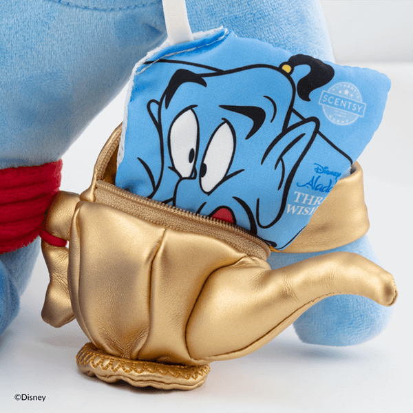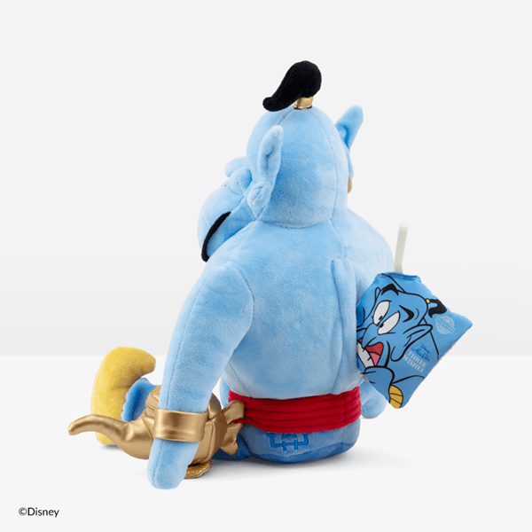 Standing 16 inches tall, Genie features a soft, huggable design and includes a zippered back pocket that holds a pre-selected Disney Aladdin: Three Wishes Scent Pak—a playful, kid-friendly fragrance that adds just the right touch of magic. His iconic gold lamp is attached and even includes its own zippered compartment, perfect for storing an extra Scent Pak or tiny treasures.