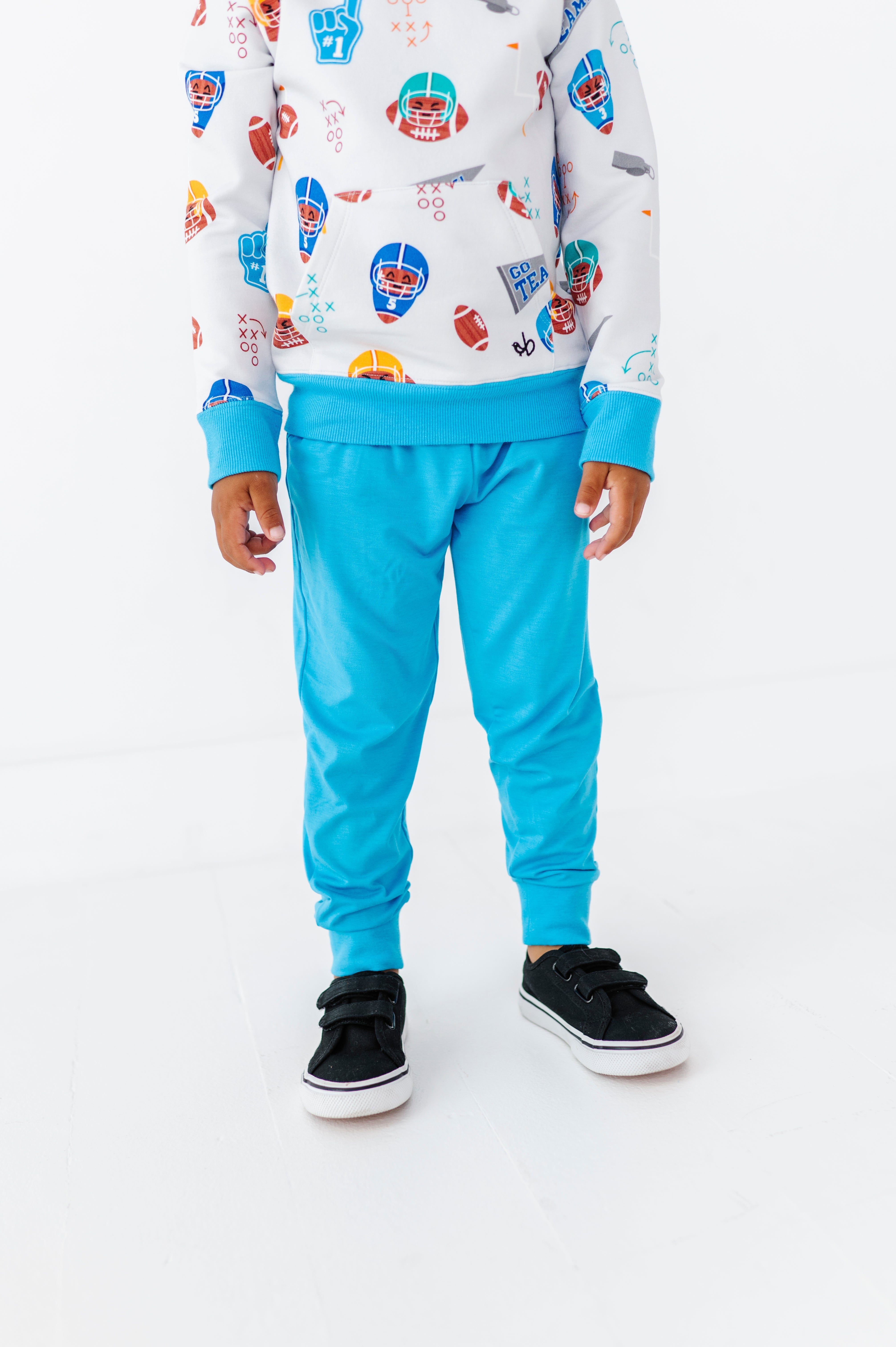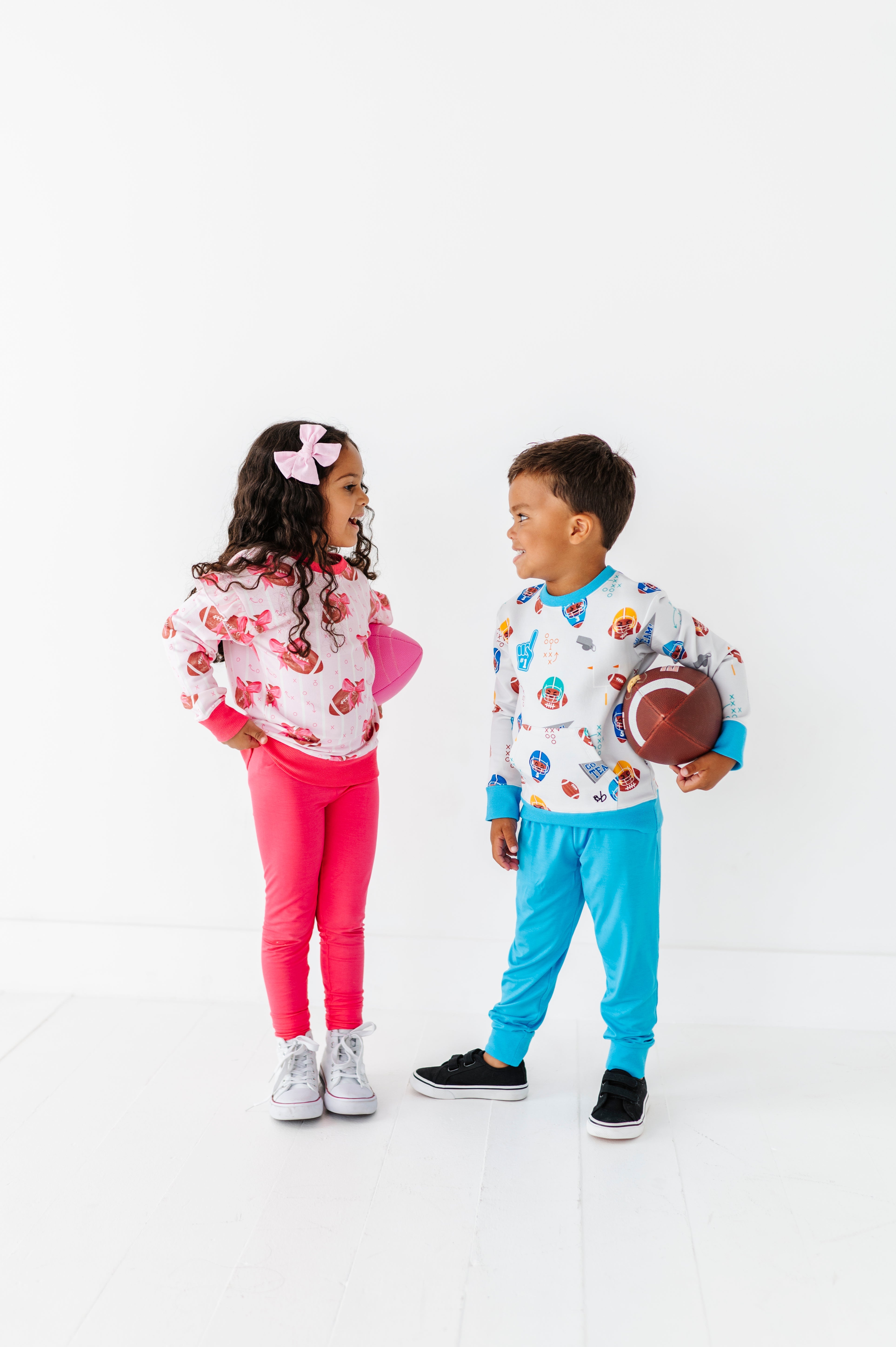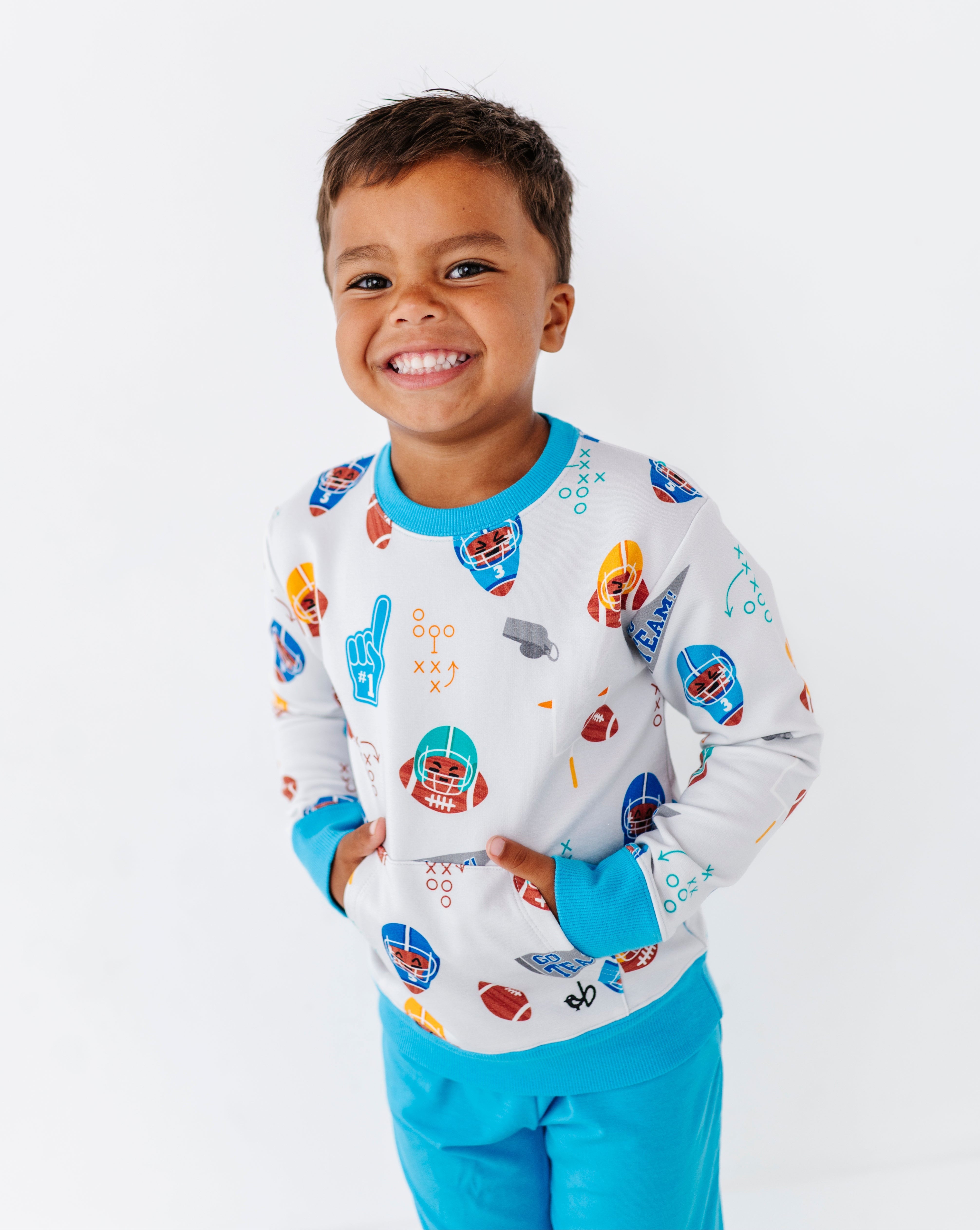 Suit up for cozy game days in our football faces sweatshirt! Featuring a fun all-over print of colorful football helmets, foam fingers, pennants, and playful plays, this pullover brings big energy to little wardrobes. Made from our signature ultra-soft bamboo blend, it’s perfect for layering on school days, tailgates, or weekend lounging. Pair it with joggers or denim for an easy win!